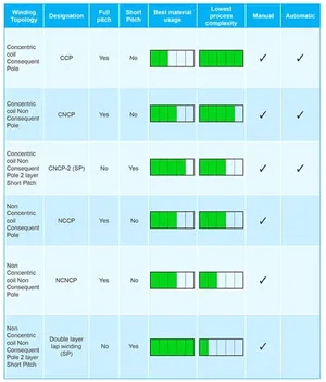De onderstaande tabel geeft enkele van de meest voorkomende wikkelingsconfiguraties weer, samen met de belangrijkste selectiecriteria. Het is duidelijk dat er sterke compromissen moeten worden gesloten tussen technische vereisten, procescomplexiteit, automatiseringsniveau en kosten. Dit betekent dat motorontwerpers nauw moeten samenwerken met de productieafdeling om de beste totaaloplossing te definiëren.