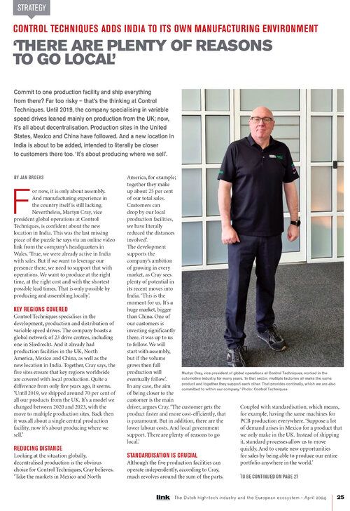 Control Techniques specialises in the development, production and distribution of variable speed drives. The company boasts a global network of 23 drive centres, including one in Sliedrecht. And it already had production facilities in the UK, North America, Mexico and China, as well as the new location in India. Together, Cray says, the five sites ensure that key regions worldwide are covered with local production. Quite a difference from only five years ago, it seems. ‘Until 2019, we shipped around 70 per cent of all our products from the UK. It’s a model we changed between 2020 and 2023, with the move to multiple production sites. Back then it was all about a single central production facility, now it’s about producing where we sell.’