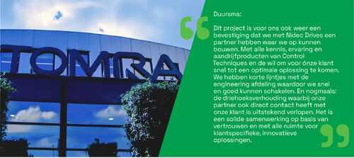 Inmiddels wordt er landelijk gewerkt aan het vervangen van de aandrijvingen van specifiek de Z-conveyor door de nieuwe frequentiegeregelde 3-fase motoren. Terugkijkend op het proces van samenwerking tussen de drie bedrijven om snel tot deze oplossing te komen, wordt een schoolvoorbeeld zichtbaar. TOMRA is zeer tevreden over de snelle actie van Duursma en de oplossing die uiteindelijk is geboden in samenwerking met Nidec Drives.