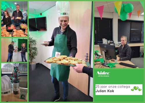 Onze collega is 25 jaar in dienst en dat hebben we donderdag 9 maart goed gevierd met een smakelijke lunch met collega’s, een speech vol met herinneringen en als klap op de vuurpijl mocht Julian beschuitjes uitdelen met groen/witte muisjes. Deze collega is groot fan van muisjes en voor deze gelegenheid waren er muisjes in onze favoriete kleur: groen