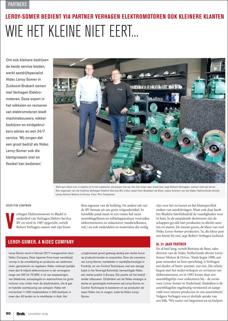 Om ook kleinere bedrijven de beste service bieden, werkt aandrijfspecialist Nidec Leroy-Somer in Zuidoost-Brabant samen met Verhagen Elektromotoren. Deze expert in het wikkelen en reviseren van elektromotoren biedt machinebouwers, wikkelbedrijven en eindgebruikers advies en een 24/7 service. ‘Wij zorgen dat een groot bedrijf als Nidec Leroy-Somer ook die klantgroepen snel en flexibel kan bedienen.’
