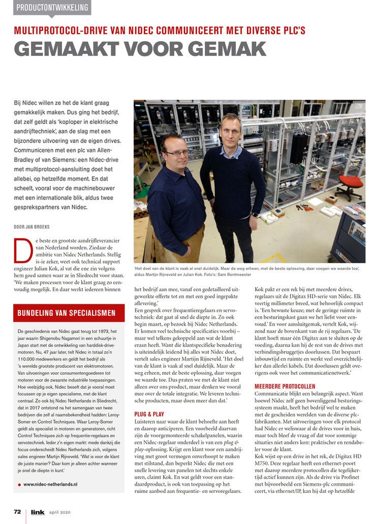 Communiceren met een plc van Allen-Bradley of van Siemens: een Nidec-drive met multiprotocol-aansluiting doet het allebei, op hetzelfde moment. En dat scheelt, vooral voor de machinebouwer met een internationale blik, aldus twee gesprekspartners van Nidec.