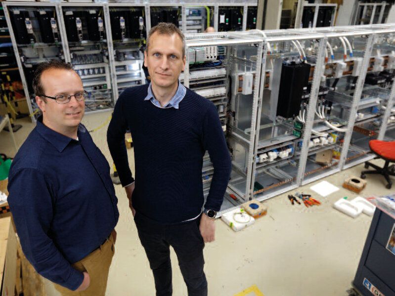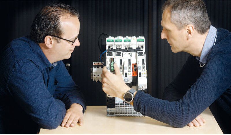 Martijn Rijneveld (links) en Julian Kok van Nidec, met tussen hen in de Digitax HD-serie. Het multiprotocol – de grijze aansluitingen aan de bovenkant van de Digitax – is zichtbaar boven het zwarte gedeelte. ‘Daarmee hoeft de klant nog maar één type regelaar op voorraad te houden.’