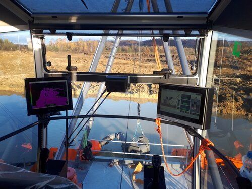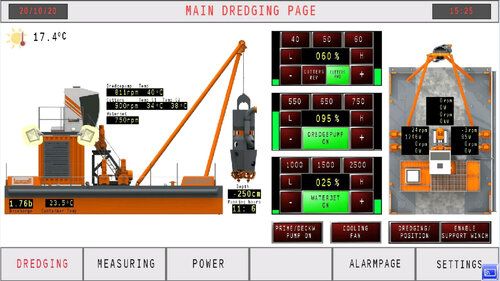 Vanuit de cabine heeft de operator goed zicht op het plaatsen, bedienen en positioneren van de dredger. Naast de twee joysticks beschikt hij over een touchscreen HMI, ontwikkeld door PTS. De machinist kan vandaaruit de pomp starten en stoppen, toerental regelen en diepte van de pomp bepalen. Bij een storing, bijvoorbeeld als een te grote steen de ingang van de pomp blokkeert, komt er vanuit de HMI een alarm. Dan slaan de cutterkoppen vast, loopt de stroom snel op en wordt een groen balkje op de HMI rood in plaats van groen. Piek: “Dit hebben we zo geautomatiseerd dat op het moment dat er een steen tussen de dubbele cutter komt, de koppen automatisch even de andere kant opdraaien. Is het stroomniveau weer voldoende gezakt, dan draaien ze weer de juiste kant op.” Van den Outenaar vult hem aan: “Als dat blijft gebeuren dan moet je de pomp omhoog halen, de steen verwijderen en de pomp weer laten zakken. Bovendien heeft de machinist naast de HMI met touchscreen nog een scherm. Dat is het scherm van de Bell baggercomputer. Hiervoor wordt eerst een scan (survey) gemaakt van de bodem. Zo kan de machinist zien hoe diep deze is en waar hij is geweest met de pomp. Hij kan dat zien aan de verschillende kleuren op het scherm.”