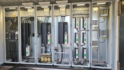 Alle schakelkasten met frequentieregelaars staan in de container opgesteld. Er komt 6000 V naar binnen, van de 6000 V gaat het via een transformator naar 690 V voor de grote motoren. V.l.n.r. de pomp (190 kW), de waterjet (75 kW) en de cutters (2 x 30 kW). Alle lieren (7,5 kW) werken op 400 V, dus de vier positioneerlieren, de servicelier en de hijslier