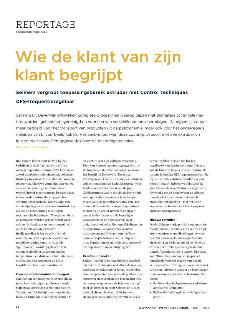 Ing. Martijn Schutz is procurementmanager en werkt inmiddels 22 jaar bij Selmers. Hij ziet als geen ander wat de verschillende ontwikkelingen op het vlak van frequentieregelaars het bedrijf hebben gebracht. “Voor Selmers betekent het grotere regelbereik van de DFS-frequentieregelaar onder andere dat er met één type extruder een brede range aan pijpen is te coaten. Onze klanten hoeven hierdoor voor verschillende afmetingen geen verschillende machines in te zetten. Een enorme tijden kostenbesparing. Bovendien stelde het ons in staat om bij gelijkblijvende capaciteit van de extruder een kleinere aandrijving toe te passen. Dit resulteert in lagere kosten en een lager energieverbruik terwijl de machine een lager gewicht krijgt.“ Teun van Breugel vult aan: “De brede inzetbaarheid van de frequentieregelaars biedt uiteraard ook mogelijkheden voor een veelvoud aan andere machines waaronder pompen, ventilatoren, compressoren en algemene applicaties waaronder extruders, crushers, mixers, kranen en transportbanden”.